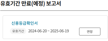 새로운 평가신청 창이 뜨는데 직전에 한국평가데이터의 신용등급확인서 사용하셨으면 아래 화면의 "연장" 클릭해 주세요.
