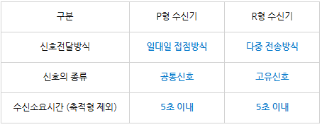| 1. 신호전달방식 ① P형 수신기 ② R형 수신기 2.신호의 종류 ① P형 수신기 ② R형 수신기 3. 수신소요시간 (축적형 제외) ① P형 수신기 ② R형 수신기 |