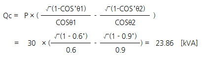 | 답 1. Y-△ 기동방식 2. ※ 전력용 콘덴서 용량 Qc [kVA], 펌프용량 P [kVA], 기존(개선전) 역률 COS1, 개선후 역률 COS2 ![]() |