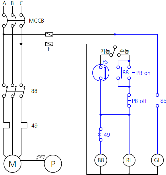 ![]() * 전원이 인가되면 GL램프가 점등 * 자동일 경우 플로트스위치가 붙으면(동작하면) RL램프가 점등되고 전자접촉기88이 여자되어 GL램프가 소등되며 펌프모터가 동작 * 수동일 경우 누름버튼스위치 PB-on을 시키면 전자접촉기 88이 여자되어 RL램프가 점등되고 GL램프가 소등되며 펌프모터가 동작 * 수동일 경우 누름버튼스위치 PB-off를 시키거나 계전기 49가 동작하면 RL램프가 소등되고 GL램프가 점등되며 펌프모터가 정지 * 기구 : 전자접촉기88 1개, a접점 1개, PB-on접점 1개, PB-off접점 1개, RL램프 1개, GL램프 1개, 계전기49 b접점 1개, 플로트스위치FS 1개 1. 미완성 회로도를 완성하기 2. 49와 MCCB의 우리말 명칭 ① 49 : ② MCCB : |